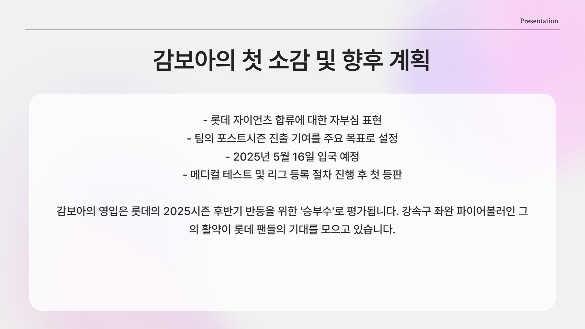 현재 롯데는 후반기 도약을 위한 선발진 리빌딩 중이며, 감보아가 빠르게 적응해 자이언츠의 에이스로 자리잡을 수 있을지 기대가 모아집니다.